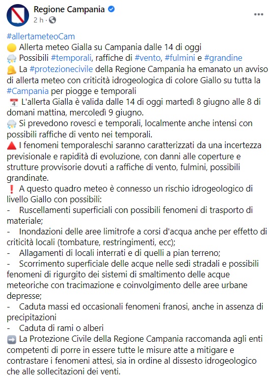 Questo quanto apprendiamo dalla pagina fb della Regione Campania: "Allerta meteo Gialla su Campania dalle 14 di oggi Possibili temporali, raffiche di vento, fulmini e grandine La protezione civile della Regione Campania ha emanato un avviso di allerta meteo con criticità idrogeologica di colore Giallo su tutta la Campania - si legge nella nota - per piogge e temporali L'allerta Gialla è valida dalle 14 di oggi martedì 8 giugno alle 8 di domani mattina, mercoledì 9 giugno. Si prevedono rovesci e temporali, localmente anche intensi con possibili raffiche di vento nei temporali. I fenomeni temporaleschi saranno caratterizzati da una incertezza previsionale e rapidità di evoluzione, con danni alle coperture e strutture provvisorie dovuti a raffiche di vento, fulmini, possibili grandinate. A questo quadro meteo è connesso un rischio idrogeologico di livello Giallo - si legge nella nota - con possibili: - Ruscellamenti superficiali con possibili fenomeni di trasporto di materiale; - Inondazioni delle aree limitrofe a corsi d'acqua anche per effetto di criticità locali (tombature, restringimenti, ecc); - Allagamenti di locali interrati e di quelli a pian terreno; - Scorrimento superficiale delle acque nelle sedi stradali e possibili fenomeni di rigurgito dei sistemi di smaltimento delle acque meteoriche con tracimazione e coinvolgimento delle aree urbane depresse; - Caduta massi ed occasionali fenomeni franosi, anche in assenza di precipitazioni - Caduta di rami o alberi - si legge nella nota - La Protezione Civile della Regione Campania raccomanda agli enti competenti di porre in essere tutte le misure atte a mitigare e contrastare i fenomeni attesi, sia in ordine al dissesto idrogeologico che alle sollecitazioni dei venti."