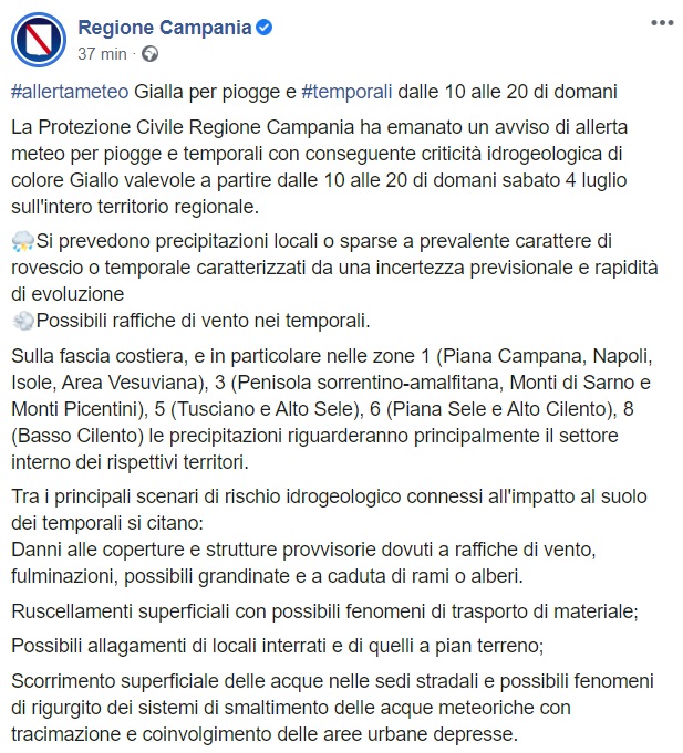 Questo quanto pubblicato sulla pagina facebook della Regione Campania: