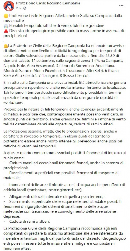 Questo quanto pubblicato sulla pagina facebook della Prot. Civile della Regione Campania:
