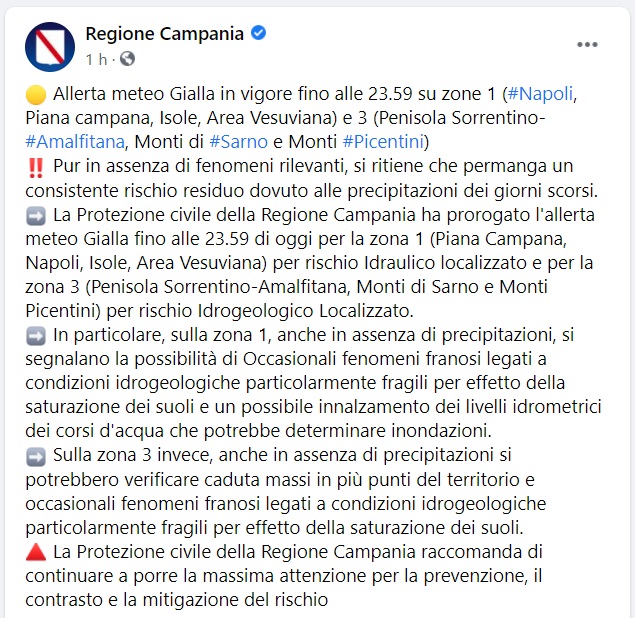 Questo quanto apprendiamo dalla pagina fb della Regione: "Allerta meteo Gialla in vigore fino alle 23.59 su zone 1 (Napoli, Piana campana, Isole, Area Vesuviana) e 3 (Penisola Sorrentino-Amalfitana, Monti di Sarno e Monti Picentini) - si legge nella nota - Pur in assenza di fenomeni rilevanti, si ritiene che permanga un consistente rischio residuo dovuto alle precipitazioni dei giorni scorsi. La Protezione civile della Regione Campania ha prorogato l'allerta meteo Gialla fino alle 23.59 di oggi per la zona 1 (Piana Campana, Napoli, Isole, Area Vesuviana) per rischio Idraulico localizzato e per la zona 3 (Penisola Sorrentino-Amalfitana, Monti di Sarno e Monti Picentini) per rischio Idrogeologico Localizzato. In particolare - si legge nella nota -, sulla zona 1, anche in assenza di precipitazioni, si segnalano la possibilità di Occasionali fenomeni franosi legati a condizioni idrogeologiche particolarmente fragili per effetto della saturazione dei suoli e un possibile innalzamento dei livelli idrometrici dei corsi d'acqua che potrebbe determinare inondazioni. Sulla zona 3 invece, anche in assenza di precipitazioni si potrebbero verificare caduta massi in più punti del territorio e occasionali fenomeni franosi legati a condizioni idrogeologiche particolarmente fragili per effetto della saturazione dei suoli. La Protezione civile della Regione Campania - si legge nella nota - raccomanda di continuare a porre la massima attenzione per la prevenzione, il contrasto e la mitigazione del rischio"