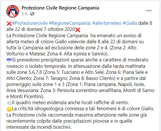 Questo quanto comunicato dalla Prot. Civile della Regione Campania