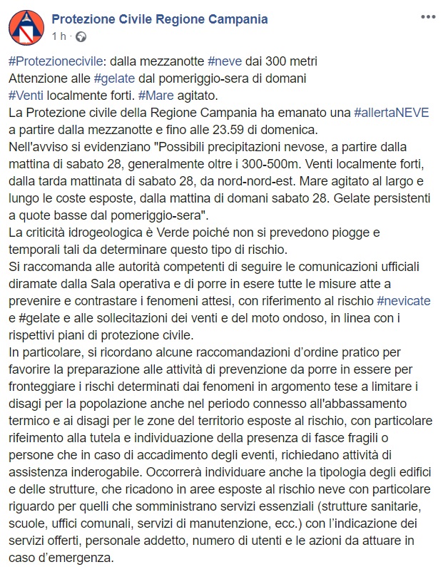 Questo quanto pubblicato sulla pagina facebook della Protezione Civile della Regione Campania: