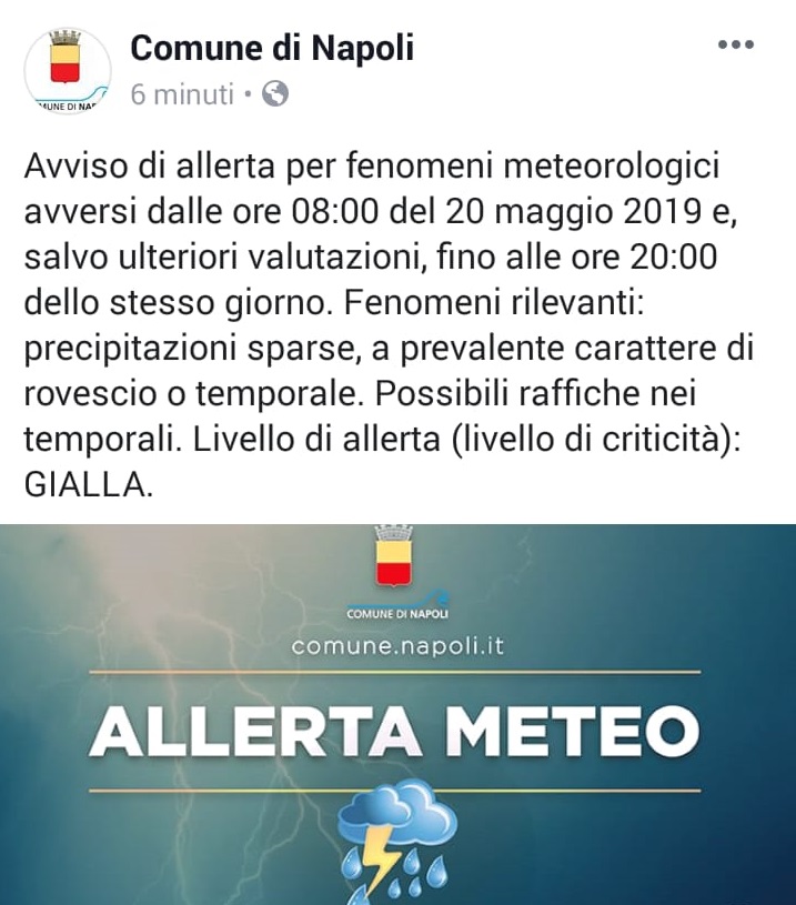 Scatta dalle 8:00 di domattina l'allerta meteo con codice giallo. Qui il bollettino diramato dalla Protezione civile e questo quanto pubblicato dal profilo Facebook del Comune di Napoli.
