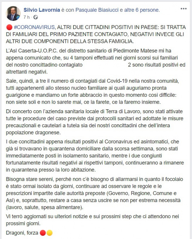 Questo quanto comunicato nella notte dal Sindaco del Comune di Dragoni