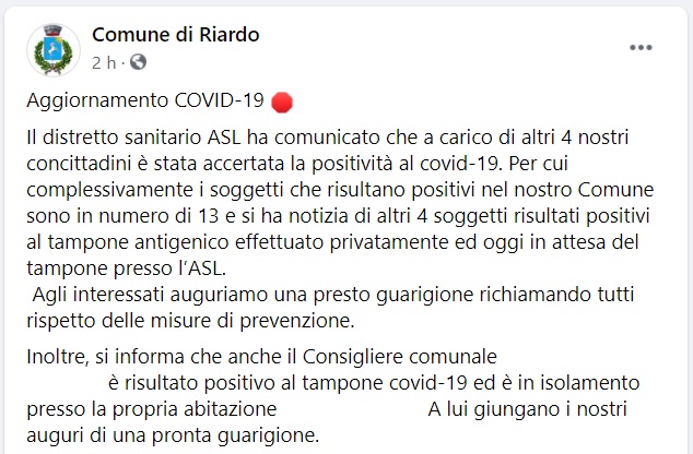 Questo quanto apprendiamo dalla pagina facebook del Comune di Riardo: "Aggiornamento COVID-19 Il distretto sanitario ASL ha comunicato che a carico di altri 4 nostri concittadini è stata accertata la positività al covid-19. Per cui complessivamente - si legge nella nota - i soggetti che risultano positivi nel nostro Comune sono in numero di 13 e si ha notizia di altri 4 soggetti risultati positivi al tampone antigenico effettuato privatamente ed oggi in attesa del tampone presso l’ASL. Agli interessati auguriamo una presto guarigione richiamando tutti rispetto delle misure di prevenzione. Inoltre, si informa che anche il Consigliere comunale ... è risultato positivo al tampone covid-19 - si legge nella nota - ed è in isolamento presso la propria abitazione ... . A lui giungano i nostri auguri di una pronta guarigione."