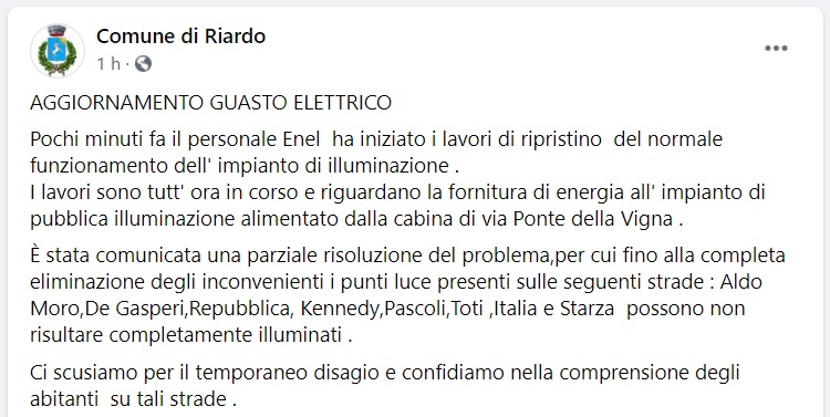 Questo quanto pubblicato sulla pagina facebook del Comune di Riardo