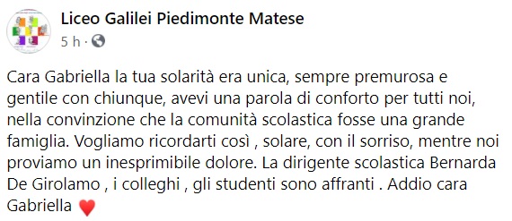 Questo il messaggio di cordoglio che apprendiamo dalla pagina facebook del Liceo Galilei di Piedimonte Matese: "Cara Gabriella la tua solarità era unica, sempre premurosa e gentile con chiunque, avevi una parola di conforto per tutti noi - si legge nella nota -, nella convinzione che la comunità scolastica fosse una grande famiglia. Vogliamo ricordarti così, solare, con il sorriso, mentre noi proviamo un inesprimibile dolore. La dirigente scolastica Bernarda De Girolamo, i colleghi, gli studenti sono affranti. Addio cara Gabriella".