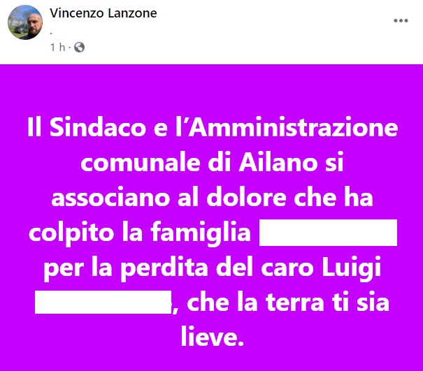 Questo il messaggio di cordoglio che apprendiamo dalla pagina facebook del Sindaco di Ailano: "Il Sindaco e l’Amministrazione comunale di Ailano si associano al dolore - si legge nella nota - che ha colpito la famiglia ... per la perdita del caro Luigi ..., che la terra ti sia lieve."