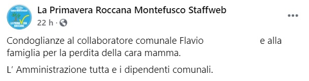 "Condoglianze al collaboratore comunale Flavio ... e alla famiglia per la perdita- si legge nella nota- della cara mamma. L’Amministrazione tutta e i dipendenti comunali."