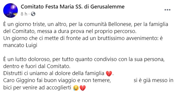 "È un giorno triste, un altro, per la comunità Bellonese, per la famiglia del Comitato, messa a dura prova nel proprio percorso. Un giorno che ci mette di fronte ad un bruttissimo avvenimento: è mancato Luigi .... È un lutto doloroso, per tutto quanto condiviso con la sua persona, dentro- si legge nella nota- e fuori dal Comitato. Distrutti ci uniamo al dolore della famiglia. Caro Giggino fai buon viaggio e non temere, ... si è già messo in bici per venire ad accoglierti"