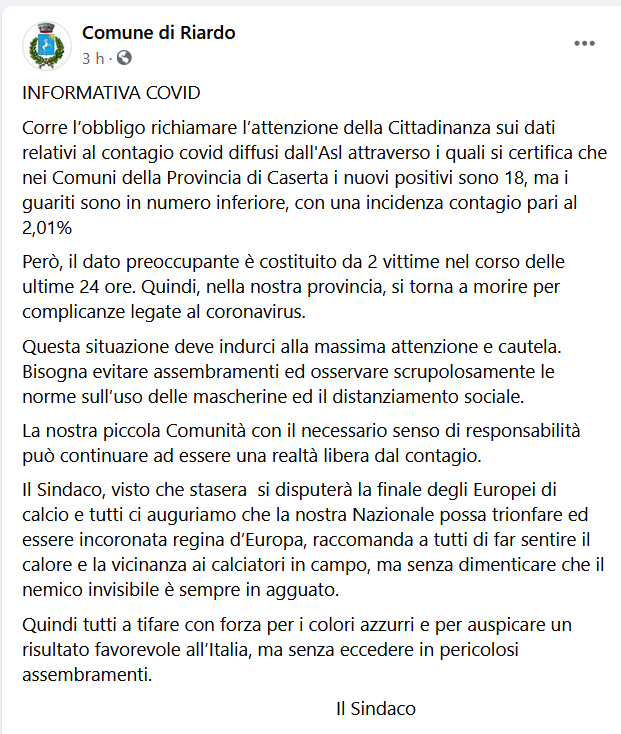 Questo il post pubblicato sulla pagina Facebook del Comune di Riardo: "Corre l’obbligo richiamare l’attenzione della Cittadinanza sui dati relativi al contagio covid diffusi dall'Asl attraverso i quali si certifica che nei Comuni della Provincia di Caserta i nuovi positivi sono 18, ma i guariti sono in numero inferiore, con una incidenza contagio pari al 2,01%. Però - si legge nel post - il dato preoccupante è costituito da 2 vittime nel corso delle ultime 24 ore. Quindi, nella nostra provincia, si torna a morire per complicanze legate al coronavirus. Questa situazione deve indurci alla massima attenzione e cautela. Bisogna evitare assembramenti ed osservare scrupolosamente le norme sull’uso delle mascherine ed il distanziamento sociale. La nostra piccola Comunità - recita ancora il post - con il necessario senso di responsabilità può continuare ad essere una realtà libera dal contagio. Il Sindaco, visto che stasera si disputerà la finale degli Europei di calcio e tutti ci auguriamo che la nostra Nazionale possa trionfare ed essere incoronata regina d’Europa, raccomanda - prosegue il post - a tutti di far sentire il calore e la vicinanza ai calciatori in campo, ma senza dimenticare che il nemico invisibile è sempre in agguato.Quindi tutti a tifare con forza per i colori azzurri e - conclude - per auspicare un risultato favorevole all’Italia, ma senza eccedere in pericolosi assembramenti".