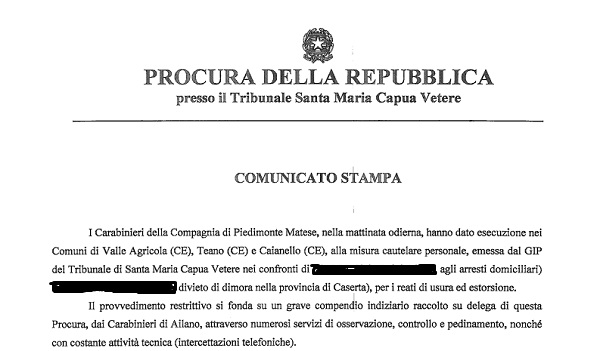Questo parte del comunicato inviatoci dalla Procura della Repubblica presso il Tribunale di Santa Maria Capua Vetere.