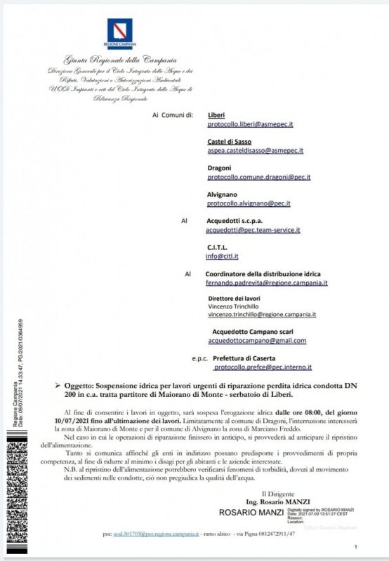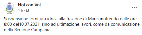 Questo il post pubblicato sulla Pagina Facebook 'Noi con Voi': "Sospensione fornitura idrica alla frazione di Marcianofreddo dalle ore 8:00 del10.07.2021, sino ad ultimazione lavori - si legge nel post - come da comunicazione della Regione Campania".