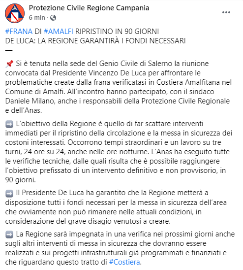 Questo il post pubblicato sulla pagina Facebook della Protezione civile Regione Campania: "Frana di Amalfi. Ripristino in 90 giorni. De Luca: La regione garanitrà i fondi necessari. Si è tenuta nella sede del Genio Civile di Salerno - si legge nel post - la riunione convocata dal Presidente Vincenzo De Luca per affrontare le problematiche create dalla frana verificatasi in Costiera Amalfitana nel Comune di Amalfi. All’incontro hanno partecipato, con il sindaco Daniele Milano - si legge ancora - anche i responsabili della Protezione Civile Regionale e dell’Anas. L’obiettivo della Regione è quello di far scattare interventi immediati per il ripristino della circolazione e la messa in sicurezza dei costoni interessati. Occorrono - continua il post - tempi straordinari e un lavoro su tre turni, 24 ore su 24, anche nelle ore notturne. L’Anas ha eseguito tutte le verifiche tecniche, dalle quali risulta che è possibile raggiungere l’obiettivo prefissato di un intervento definitivo e non provvisorio, in 90 giorni. Il Presidente De Luca - continua il post - ha garantito che la Regione metterà a disposizione tutti i fondi necessari per la messa in sicurezza dell’area che ovviamente non può rimanere nelle attuali condizioni, in considerazione del grave disagio venutosi a creare. La Regione sarà impegnata in una verifica nei prossimi giorni anche sugli altri interventi di messa in sicurezza che dovranno essere realizzati e sui progetti infrastrutturali - conclude il post - già programmati e finanziati e che riguardano questo tratto di Costiera".