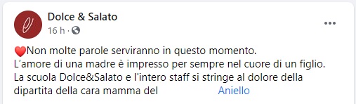 Questo il messaggio di cordoglio che apprendiamo dalla pagina facebook della scuola Dolce & Salato di Maddaloni: "Non molte parole serviranno in questo momento. L’amore di una madre - si legge nella nota - è impresso per sempre nel cuore di un figlio. La scuola Dolce&Salato e l'intero staff si stringe al dolore della dipartita della cara mamma del ... Aniello"