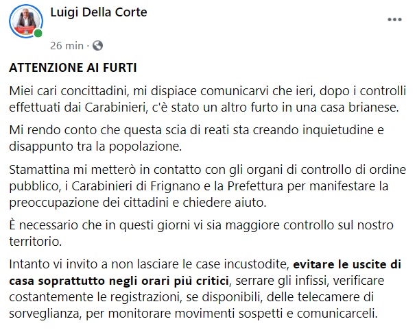 Questo quanto pubblicato sulla pagina fb del Sindaco di Villa di Briano: "ATTENZIONE AI FURTI Miei cari concittadini, mi dispiace comunicarvi che ieri, dopo i controlli effettuati dai Carabinieri, c'è stato un altro furto in una casa brianese. Mi rendo conto che questa scia di reati sta creando inquietudine e disappunto tra la popolazione. Stamattina - si legge nella nota - mi metterò in contatto con gli organi di controllo di ordine pubblico, i Carabinieri di Frignano e la Prefettura per manifestare la preoccupazione dei cittadini e chiedere aiuto. È necessario che in questi giorni vi sia maggiore controllo sul nostro territorio. Intanto vi invito a non lasciare le case incustodite, evitare le uscite di casa soprattutto negli orari più critici, serrare gli infissi, verificare costantemente le registrazioni, se disponibili, delle telecamere di sorveglianza, per monitorare movimenti sospetti e comunicarceli."