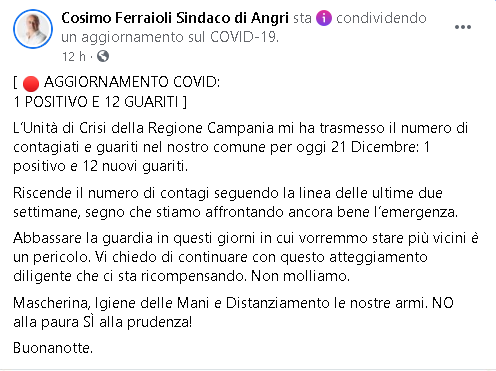 Lo apprendiamo dalla pagina Facebook del Sindaco di Angri, Cosimo Ferraioli.