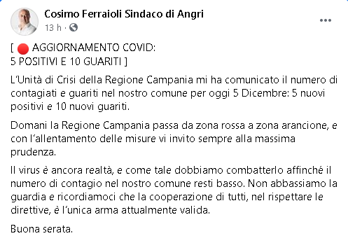 Lo apprendiamo dalla pagina Facebook del Sindaco di Angri, Cosimo Ferraioli.