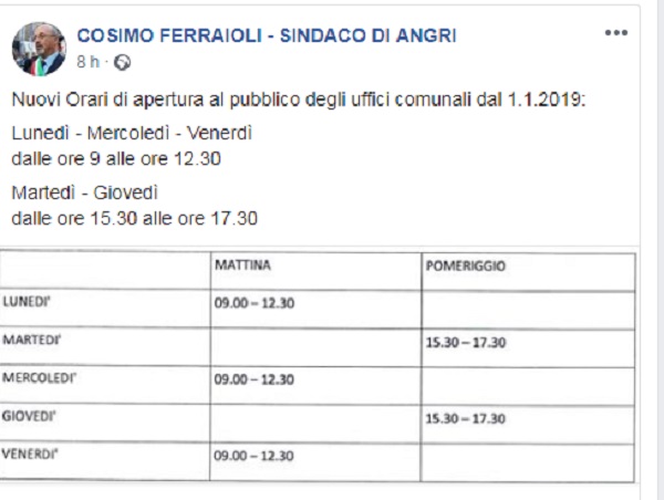 Questo il post pubblicato sulla pagina fb ufficiale del Sindaco di Angri Cosimo Ferraioli