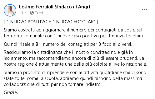 Lo apprendiamo dalla pagina Facebook del Sindaco di Angri, Cosimo Ferraioli.