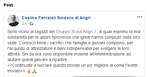 "Sono vicino ai ragazzi del Gruppo Scout Angri 1, ai quali esprimo la mia solidarietà per le azioni riprovevoli che ignoti hanno compiuto nella loro sede. Conosco bene i sacrifici che famiglie e giovani compiono, per l'acquisto di attrezzature e beni indispensabili per svolgere le loro attività. Sin da ora sono disponibile insieme all'Amministrazione ad aiutare questi giovani a ripartire. <<Continuate a lasciare questo mondo un po' migliore di come l'avete trovato>>."