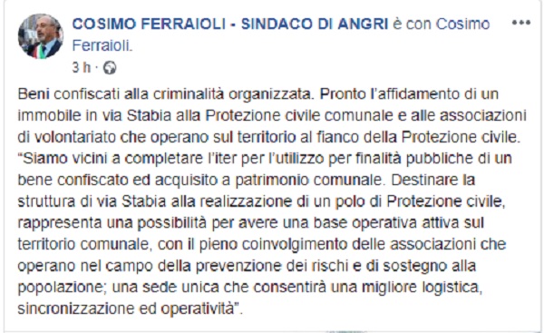 Questo il post pubblicato sulla pagina fb ufficiale del Sindaco di Angri Cosimo Ferraioli.