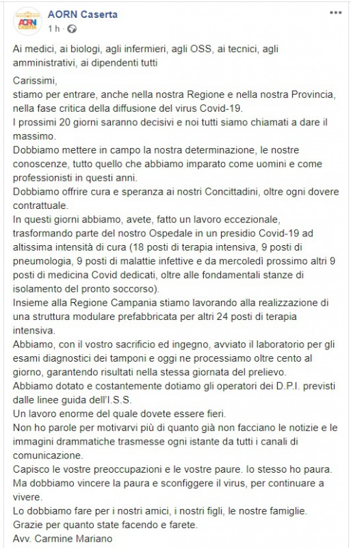 Questo quanto pubblicato sulla pagina facebook AORN Caserta