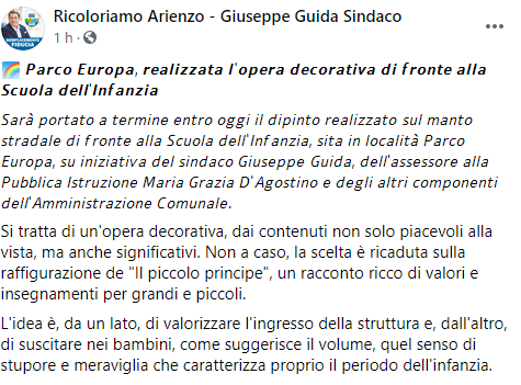 Questo il post pubblicato sulla pagina Facebook 'Ricoloriamo Arienzo-Giuseppe Guida Sindaco': "Parco Europa, realizzata l'opera decorativa di fronte alla Scuola dell'infanzia. Sarà portato a termine entro oggi il dipinto realizzato sul manto stradale di fronte alla Scuola dell'Infanzia, sita in località Parco Europa, su iniziativa - si legge nel post - del sindaco Giuseppe Guida, dell'assessore alla Pubblica Istruzione Maria Graziia D'Agostino e degli altri componenti dell'Amministrazione Comunale. Si tratta di un'opera decorativa, dai contenuti non solo piacevoli alla vista, ma anche significativi. Non a caso, la scelta è ricaduta sulla raffigurazione de "Il piccolo principe", un racconto ricco di valori e insegnamenti per grandi e piccoli. L'idea è, da un lato - prosegue il post - di valorizzare l'ingresso della struttura e, dall'altro, di suscitare nei bambini, come suggerisce il volume, quel senso di stupore e meraviglia che caratterizza proprio il periodo dell'infanzia".