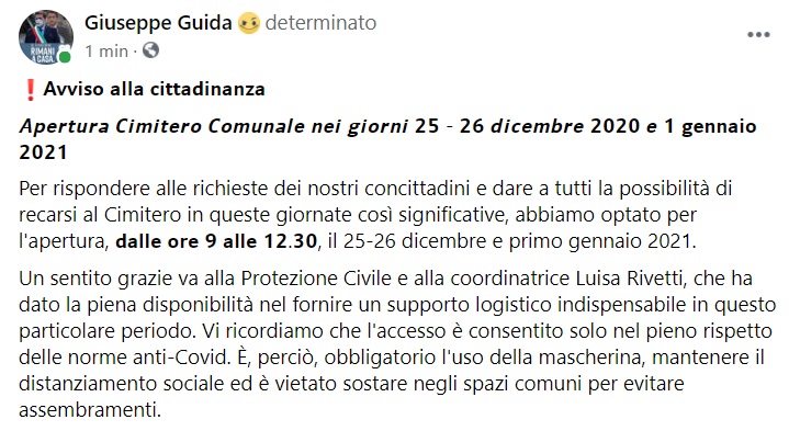 Questo quanto apprendiamo dalla pagina facebook del Sindaco Guida: