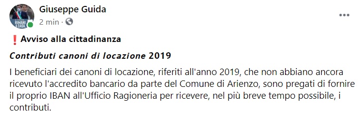 Questo quanto apprendiamo dalla pagina facebook del Sindaco Guida: