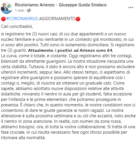 Questo il post pubblicato dal Sindaco di Arienzo Giuseppe Guida sulla sua pagina Facebook: "Aggiornamento. Cari concittadini, si registrano tre (3) nuovi casi, di cui due appartenenti a un nuovo nucleo familiare e uno rientrante in un contesto già monitorato, in cui vi sono altri positivi. Tutti sono in isolamento domiciliare. Si registrano tre (3) guariti. Attualmente i positivi ad Arienzo sono 64. La curva - si legge nel post - come il totale, è costante. Oggi registriamo altri tre contagi, bilanciati da altrettante guarigioni. La nostra situazione riacquista una certa stabilità. Tuttavia, il dato è ancora alto e non possiamo escludere ulteriori incrementi, seppur lievi. Allo stesso tempo, ci aspettiamo di registrare altre guarigioni e possiamo sperare di equilibrare così i contagi o, meglio, di riuscire ad ottenere un graduale calo. Come sapete - prosegue il Sindaco - abbiamo adottato nuove disposizioni relative alle attività didattiche, rinviando il rientro in aula per gli studenti, fatta eccezione per l'infanzia e le prime elementari, che potranno proseguire in presenza. È chiaro che, in questo momento, le nostre condizioni non ci consentono di dare le giuste garanzie ai nostri ragazzi. La nostra attenzione è sulla prossima settimana e su ciò che accadrà, visto anche il rientro in zona arancione. In realtà - conclude il Sinadaco - con numeri da zona rossa, abbiamo bisogno, ora, di tutta la vostra collaborazione. Si tratta di una fase cruciale, in cui risulta necessario fare ogni sforzo possibile per ritornare alla normalità".