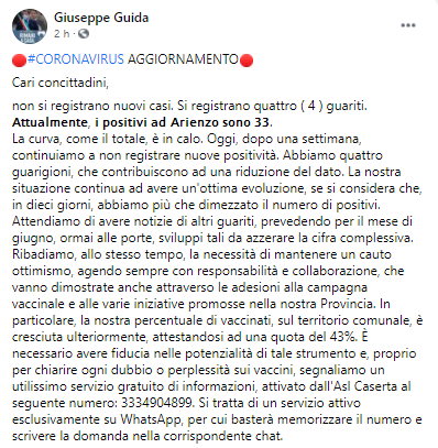 Questo parte del post pubblicato sulla sua pagina Facebook dal Sindaco di Arienzo Giuseppe Guida: "Cari concittadini, non si registrano nuovi casi. Si registrano quattro ( 4 ) guariti. Attualmente, i positivi ad Arienzo sono 33. La curva, come il totale, è in calo. Oggi - si legge nel post - dopo una settimana, continuiamo a non registrare nuove positività. Abbiamo quattro guarigioni, che contribuiscono ad una riduzione del dato. La nostra situazione continua ad avere un'ottima evoluzione, se si considera che, in dieci giorni, abbiamo più che dimezzato il numero di positivi. Attendiamo - prosegue il Sindaco - di avere notizie di altri guariti, prevedendo per il mese di giugno, ormai alle porte, sviluppi tali da azzerare la cifra complessiva. Ribadiamo, allo stesso tempo, la necessità di mantenere un cauto ottimismo, agendo sempre con responsabilità e collaborazione, che vanno dimostrate anche attraverso le adesioni alla campagna vaccinale e alle varie iniziative promosse nella nostra Provincia. In particolare - si legge ancora nel post - la nostra percentuale di vaccinati, sul territorio comunale, è cresciuta ulteriormente, attestandosi ad una quota del 43%. È necessario avere fiducia nelle potenzialità di tale strumento e, proprio per chiarire ogni dubbio o perplessità sui vaccini, segnaliamo un utilissimo servizio gratuito di informazioni, attivato dall'Asl Caserta al seguente numero: 3334904899. Si tratta di un servizio attivo - conclude il post - esclusivamente su WhatsApp, per cui basterà memorizzare il numero e scrivere la domanda nella corrispondente chat (...)".