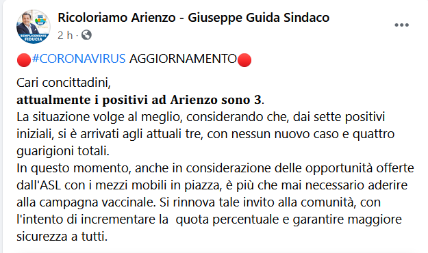 Questo il post pubblicato sulla pagina Facebook di Giuseppe Guida, sindaco di Arienzo: "Cari concittadini, attualmente i positivi ad Arienzo sono 3. La situazione - si legge nel post - volge al meglio, considerando che, dai sette positivi iniziali, si è arrivati agli attuali tre, con nessun nuovo caso e quattro guarigioni totali. In questo momento, anche in considerazione delle opportunità offerte dall'ASL con i mezzi mobili in piazza, è più che mai necessario aderire alla campagna vaccinale. Si rinnova - conclude - tale invito alla comunità, con l'intento di incrementare la quota percentuale e garantire maggiore sicurezza a tutti".