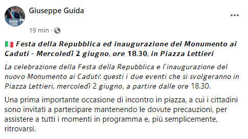 Questo il post pubblicato sulla sua pagina Facebook dal Sindaco di Arienzo Giuseppe Guida: "Festa della Repubblica ed inaugurazione del Monumento ai Caduti - Mercoledì 2 giugno, ore 18.30, in Piazza Lettieri. La celebrazione della Festa della Repubblica e l'inaugurazione del nuovo Monumento ai Caduti: questi - si legge nel post - i due eventi che svolgeranno in Piazza Lettieri, mercoledì 2 giugno, a partire dalle 18.30. Una prima importante occasione di incontro in piazza, a cui i cittadini sono invitati a partecipare mantenendo le dovute precauzioni - si legge ancora per assistere a tutti i momenti in programma e, più semplicemente, ritrovarsi".