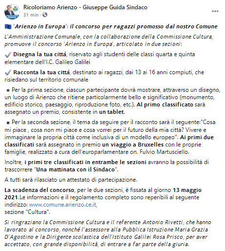 Questo il post pubblicato dal Sindaco di Arienzo Giuseppe Guida sulla sua pagina Facebook: "Arienzo in Europa: il concorso per ragazzi promosso dal nostro comune. L'amministrazione Comunale, con la collaborazione della Commissione Cultura, promuove il concorso ''Arienzo in Europa', articolato in due sezioni: Disegna la tua città - si legge nel post - riservato agli studenti delle classi quarta e quinta elementare dell'I.C. Galileo Galilei. Racconta la tua città, destinato ai ragazzi, dai 13 ai 16 anni compiuti, che risiedano sul territorio comunale. Per la prima sezione, ciascun partecipante dovrà mostrare - prosegue il post - attraverso un disegno, un luogo di Arienzo che ritiene particolarmente bello e significativo (monumento, edificio storico, paesaggio, riproduzione foto, etc.). Al primo classificato sarà assegnato un premio, consistente in un tablet. Per la seconda sezione, il tema da seguire per il racconto sarà il seguente: "Cosa mi piace , cosa non mi piace e cosa vorrei per il futuro della mia città? Vivere e immaginare la propria città come inclusiva di un modello europeo".Ai primi due classificati - si legge ancora nel post - sarà assegnato in premio un viaggio a Bruxelles con le proprie famiglie, realizzato a cura dell'europarlamentare on. Fulvio Martusciello. Inoltre, i primi tre classificati in entrambe le sezioni avranno la possibilità di trascorrere "Una mattina con il Sindaco". A tutti sarà rilasciato un attestato di partecipazione. La scadenza del concorso, per le due sezioni, è fissata al giorno 13 maggio 2021. Le informazioni e il regolamento completo sono reperibili al seguente indirizzo: ,