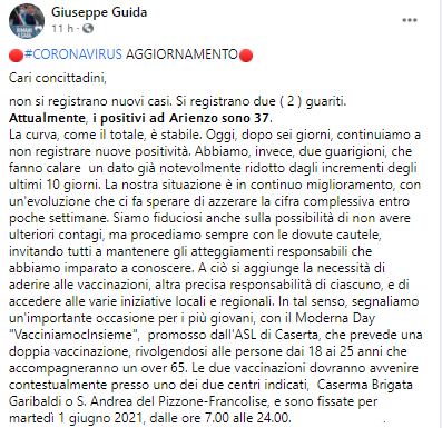 Questo parte del post pubblicato sulla sua pagina Facebook dal Sindaco di Arienzo Giuseppe Guida: "Coronavirus Aggiornamento. Cari concittadini, non si registrano nuovi casi. Si registrano due ( 2 ) guariti. Attualmente, i positivi ad Arienzo sono 37. La curva, come il totale, è stabile. Oggi, dopo sei giorni, continuiamo a non registrare nuove positività. Abbiamo, invece, due guarigioni, che - si legge nel post - fanno calare un dato già notevolmente ridotto dagli incrementi degli ultimi 10 giorni. La nostra situazione è in continuo miglioramento, con un'evoluzione che ci fa sperare di azzerare la cifra complessiva entro poche settimane. Siamo fiduciosi anche sulla possibilità di non avere ulteriori contagi, ma procediamo sempre con le dovute cautele - prosegue il post - invitando tutti a mantenere gli atteggiamenti responsabili che abbiamo imparato a conoscere. A ciò si aggiunge la necessità di aderire alle vaccinazioni, altra precisa responsabilità di ciascuno, e di accedere alle varie iniziative locali e regionali. In tal senso, segnaliamo un'importante occasione per i più giovani, con il Moderna Day 'VacciniamocInsieme", promosso dall'ASL di Caserta - si legge ancora - che prevede una doppia vaccinazione, rivolgendosi alle persone dai 18 ai 25 anni che accompagneranno un over 65. Le due vaccinazioni dovranno avvenire contestualmente presso uno dei due centri indicati, Caserma Brigata Garibaldi o S. Andrea del Pizzone-Francolise, e sono fissate per martedì 1 giugno 2021, dalle ore 7.00 alle 24.00 (...)".