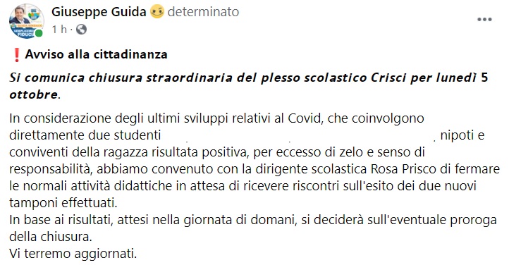 Questo quanto apprendiamo dalla pagina facebook del Sindaco Guida: