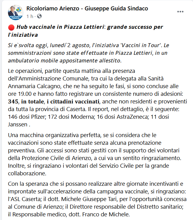 Questo il post pubblicato dal sindaco di Arienzo, Giuseppe Guida, sulla propria pagina Facebook: "Si è svolta oggi, 2 agosto, l'iniziativa Vaccini in Tour. Le somministrazioni sono state effettuate in piazza Lettieri, in un ambulatorio mobile appositamente allestito.Le operazioni, partite questa mattina alla presenza dell'Amministrazione Comunale, tra cui la delegata alla Sanità Annamaria Calcagno, che ne ha seguito le fasi, si sono concluse - si legge -alle ore 19.00 e hanno fatto registrare un consistente numero di adesioni: 345, in totale, i cittadini vaccinati, anche non residenti e provenienti da tutta la provincia di Caserta. Il report, nel dettaglio, è il seguente: 146 dosi Pfizer; 172 dosi Moderna; 16 dosi AstraZeneca; 11 dosi Janssen. Una macchina organizzativa perfetta, se si considera che le vaccinazioni sono state effettuate senza alcuna prenotazione preventiva. Gli accessi - continua il post - sono stati gestiti con il supporto dei volontari della Protezione Civile di Arienzo, a cui va un sentito ringraziamento. Inoltre, si ringraziano i volontari del Servizio Civile per la grande collaborazione. Con la speranza che si possano realizzare altre giornate incentivanti e improntate sull'accelerazione della campagna vaccinale, si ringraziano: l'ASL Caserta; il dott. Michele Giuseppe Tari, per l'opportunità concessa al Comune di Arienzo; il Direttore responsabile del Distretto sanitario; il Responsabile medico, dott. Franco de Michele.