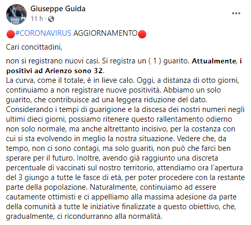 Questo il post pubblicato ieri dal Sindaco di Arienzo Giuseppe Guida sulla sua pagina Facebook: "Coronavirus aggiornamento. Cari concittadini, non si registrano nuovi casi. Si registra un ( 1 ) guarito. Attualmente, i positivi ad Arienzo sono 32. La curva, come il totale, è in lieve calo. Oggi, a distanza di otto giorni, continuiamo - si legge nel post - a non registrare nuove positività. Abbiamo un solo guarito, che contribuisce ad una leggera riduzione del dato. Considerando i tempi di guarigione e la discesa dei nostri numeri negli ultimi dieci giorni, possiamo ritenere questo rallentamento odierno non solo normale - prosegue il post - ma anche altrettanto incisivo, per la costanza con cui si sta evolvendo in meglio la nostra situazione. Vedere che, da tempo, non ci sono contagi, ma solo guariti, non può che farci ben sperare per il futuro. Inoltre - si legge ancora nel post - avendo già raggiunto una discreta percentuale di vaccinati sul nostro territorio, attendiamo ora l'apertura del 3 giungo a tutte le fasce di età, per poter procedere con la restante parte della popolazione. Naturalmente, continuiamo ad essere cautamente ottimisti e ci appelliamo alla massima adesione da parte della comunità a tutte le iniziative finalizzate a questo obiettivo, che - conclude il post - gradualmente, ci ricondurranno alla normalità".