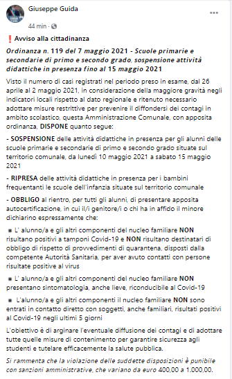 Questo il post pubblicato poco fa dal Sindaco di Arienzo Giuseppe Guida sulla sua pagina Facebook: "Avviso alla cittadinanza. Ordinanza n. 119 del 7 maggio 2021 - Scuole primarie e secondarie di primo e secondo grado, sospensione attività didattiche in presenza fino al 15 maggio 2021. Visto il numero di casi registrati - si legge nel post - nel periodo preso in esame, dal 26 aprile al 2 maggio 2021, in considerazione della maggiore gravità negli indicatori locali rispetto al dato regionale e ritenuto necessario adottare misure restrittive per prevenire il diffondersi dei contagi in ambito scolastico, questa Amministrazione Comunale, con apposita ordinanza, dispone quanto segue: sospensione delle attività didattiche in presenza per gli alunni delle scuole primarie e secondarie di primo e secondo grado situate sul territorio comunale, da lunedì 10 maggio 2021 a sabato 15 maggio 2021 - ripresa - si legge ancora nel post - delle attività didattiche in presenza per i bambini frequentanti le scuole dell'infanzia situate sul territorio comunale - obbligo al rientro, per tutti gli alunni, di presentare apposita autocertificazione, in cui il/i genitore/i o chi ha in affido il minore dichiarino espressamente che: L' alunno/a e gli altri componenti del nucleo familiare non risultano positivi a tamponi Covid-19 e non risultano destinatari - prosegue il post - di obbligo di rispetto di provvedimenti di quarantena, disposti dalla competente Autorità Sanitaria, per aver avuto contatti con persone risultate positive al virus. L' alunno/a e gli altri componenti del nucleo familiare non presentano sintomatologia, anche lieve, riconducibile al Covid-19. L'alunno/a e gli altri componenti il nucleo familiare non sono entrati in contatto diretto con soggetti, anche familiari, risultati positivi al Covid-19 negli ultimi 5 giorni. L'obiettivo - prosegue il post - è di arginare l'eventuale diffusione dei contagi e di adottare tutte quelle misure di contenimento per garantire sicurezza agli studenti e tutelare efficacemente la salute pubblica. Si rammenta che la violazione delle suddette disposizioni è punibile con sanzioni amministrative che variano da euro 400,00 a 1.000,00".