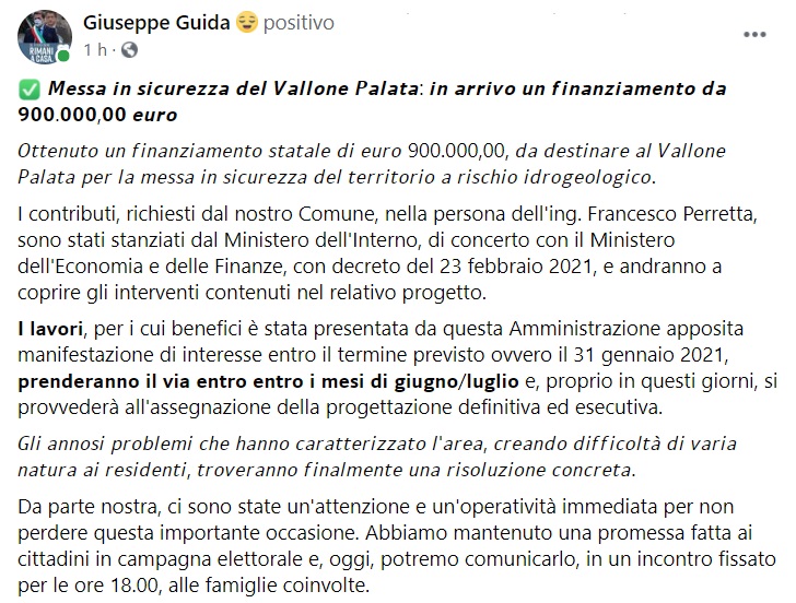 "Messa in sicurezza del Vallone Palata: in arrivo un finanziamento da 900.000,00 euro. Ottenuto un finanziamento statale di euro 900.000,00, da destinare al Vallone Palata per la messa in sicurezza del territorio- si legge nella nota- a rischio idrogeologico. I contributi, richiesti dal nostro Comune, nella persona dell'ing. Francesco Perretta, sono stati stanziati dal Ministero dell'Interno, di concerto con il Ministero dell'Economia e delle Finanze, con decreto del 23 febbraio 2021, e andranno a coprire gli interventi contenuti nel relativo progetto. I lavori, per i cui benefici è stata presentata da questa Amministrazione apposita manifestazione di interesse entro il termine previsto ovvero il 31 gennaio 2021, prenderanno il via entro i mesi di giugno/luglio e, proprio in questi giorni, si provvederà- si legge nella nota- all'assegnazione della progettazione definitiva ed esecutiva. Gli annosi problemi che hanno caratterizzato l'area, creando difficoltà di varia natura ai residenti, troveranno finalmente una risoluzione concreta. Da parte nostra, ci sono state un'attenzione e un'operatività immediata per non perdere questa importante occasione. Abbiamo mantenuto una promessa fatta ai cittadini in campagna elettorale e, oggi, potremo comunicarlo, in un incontro fissato- si legge nella nota- per le ore 18.00, alle famiglie coinvolte."