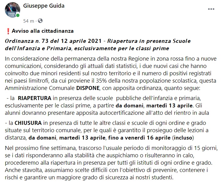 "In considerazione della permanenza della nostra Regione in zona rossa fino a nuove comunicazioni, considerando gli attuali dati statistici, i due nuovi casi che hanno coinvolto minori residenti sul nostro territorio e il numero di positivi registrati nei paesi limitrofi, da cui proviene il 35% della nostra popolazione scolastica, questa Amministrazione Comunale DISPONE, con apposita ordinanza, quanto segue: - la RIAPERTURA in presenza delle scuole pubbliche dell'infanzia e primaria, esclusivamente per le classi prime, a partire da domani, martedì 13 aprile. -Si legge nella nota- Gli alunni dovranno presentare apposita autocertificazione all'atto del rientro in aula - la CHIUSURA in presenza di tutte le altre classi e scuole di ogni ordine e grado situate sul territorio comunale, per le quali è garantito il prosieguo delle lezioni a distanza, da domani, martedì 13 aprile, fino a venerdì 16 aprile (incluso) Nel prossimo fine settimana, trascorso l'usuale periodo di monitoraggio di 15 giorni, se i dati risponderanno alla stabilità che auspichiamo o risulteranno in calo, procederemo alla riapertura in presenza per tutti gli istituti di ogni ordine e grado. -Si legge nella nota- Anche stavolta, assumiamo scelte difficili con l'obiettivo di prevenire, contenere i rischi e garantire un maggiore grado di sicurezza ai nostri studenti."