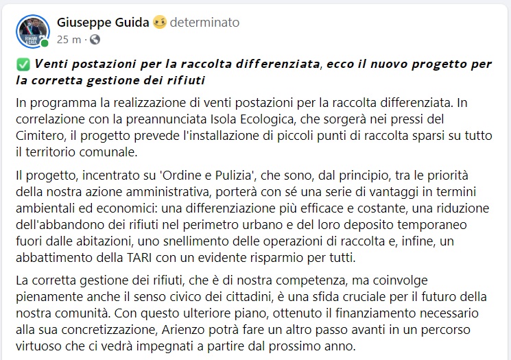 Questo quanto pubblicato sulla pagina fb del Sindaco di Arienzo