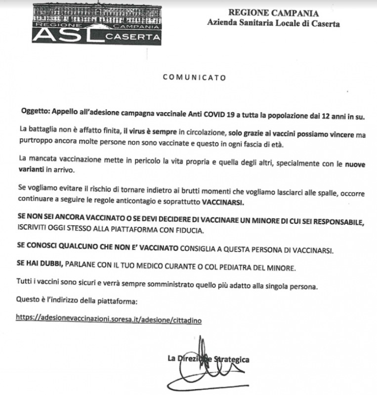 Pubblichiamo il comunicato dell'ASL Caserta che fa un appello a vaccinarsi, a tutta la popolazione dai 12 anni su. Vaccinarsi è importante ed è l'unica soluzione per uscire da questa pandemia che ormai da oltre un anno attanaglia tutti noi.