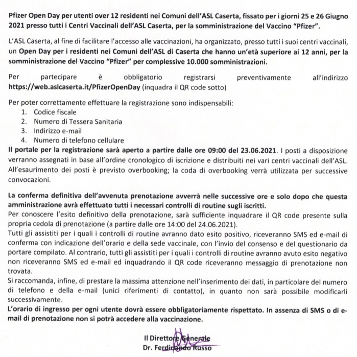 L'ASL Caserta ha comunicato che ci sarà un Pfizer Open Day presso tutti i centri vaccinali della provincia aperto ad utenti dai 12 anni in poi il prossimo 25-26 giugno. Di seguito il comunicato e le istruzione per come prenotarsi