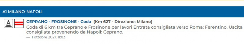 Questo qaunto apprendiamo da Autostrade: "A1 MILANO-NAPOLI LavoriCoda CEPRANO - FROSINONE - Coda (Km 627 - Direzione: Milano) Coda di 6 km tra Ceprano e Frosinone per lavori Entrata consigliata verso Roma: Ferentino. Uscita consigliata provenendo da Napoli: Ceprano. 1 ottobre 2021, 11:03"