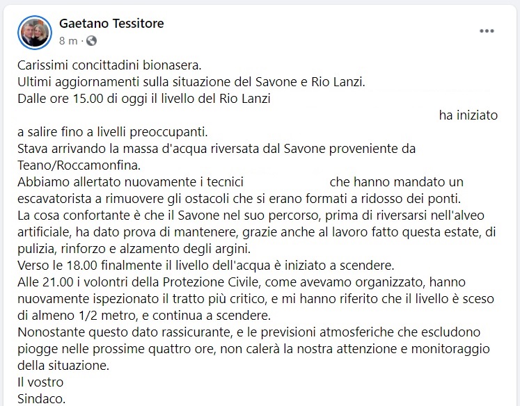 Questo quanto pubblicato sulla pagina facebook del Sindaco di Francolise