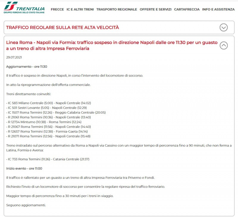 "Linea Roma - Napoli via Formia: traffico sospeso in direzione Napoli dalle ore 11:30 per un guasto a un treno di altra Impresa Ferroviaria 29.07.2021. Aggiornamento - ore 11:30 Il traffico è sospeso in direzione Napoli, in corso l’intervento del locomotore di soccorso. In atto la riprogrammazione dell'offerta commerciale. Treni direttamente coinvolti: • IC 583 Milano Centrale (5:00) - Napoli Centrale (14:02) • IC 501 Sestri Levante (5:05) - Napoli Centrale (12:29) • IC 1507 Roma Termini (12:26) - Reggio Calabria Centrale (20:05) • R 21061 Roma Termini (10:36) - Napoli Centrale (13:40) • R 12734 Minturno (10:38) - Roma Termini (12:24) • R 21067 Roma Termini (11:56) - Napoli Centrale (14:40) • R 12657 Roma Termini (12:38) - Formia-Gaeta (14:14) • R 21071 Roma Termini (12:56) - Napoli Centrale (15:48) Treno instradato sul percorso alternativo da Roma a Napoli via Cassino con un maggior tempo di percorrenza fino a 90 minuti, che non ferma a Latina, Formia e Aversa: • IC 733 Roma Termini (11:26) - Catania Centrale (21:37) Inizio evento - ore 11:00 Il traffico è rallentato per un guasto a un treno di altra Impresa Ferroviaria tra Priverno e Fondi. Richiesto l’invio di un locomotore di soccorso per consentire la regolare ripresa del traffico ferroviario. Maggior tempo di percorrenza fino a 30 minuti per i treni in viaggio. Seguono aggiornamenti."