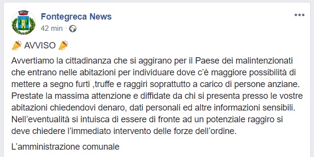 Questo quanto comunicato sulla pagina FB dal Comune di Fontegreca