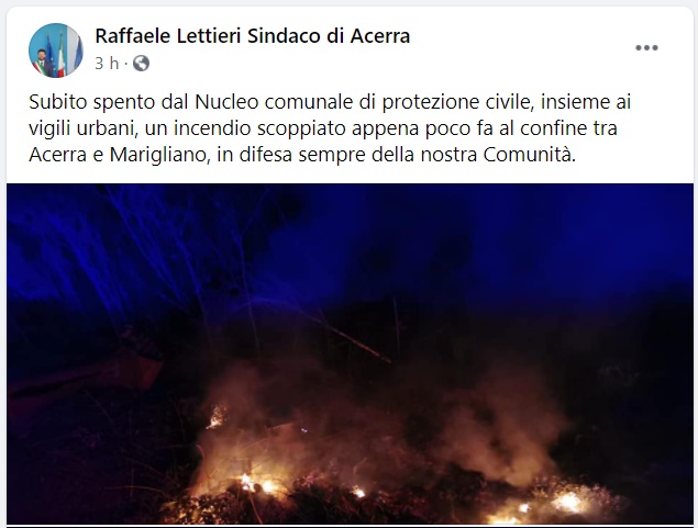 Questo quanto apprendiamo dalla pagina facebook del Sindaco di Acerra: "Subito spento dal Nucleo comunale di protezione civile, insieme ai vigili urbani, un incendio - si legge nella nota - scoppiato appena poco fa al confine tra Acerra e Marigliano, in difesa sempre della nostra Comunità."